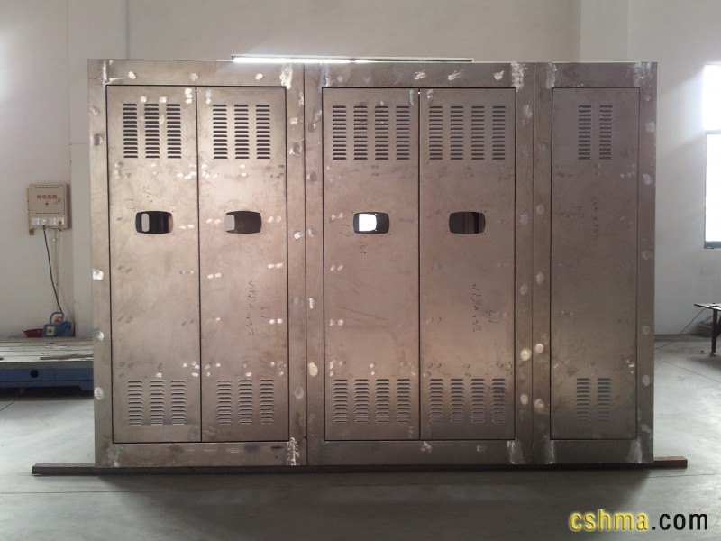 此產品名稱為組合柜,是由接地變壓器柜、消弧線圈柜和控制柜組成的三段式組合柜,箱殼尺寸為3200*1900*2300,整套柜體(含設備)的總重量約為5.5噸。箱殼為冷軋鋼板,內部自然通風散熱。